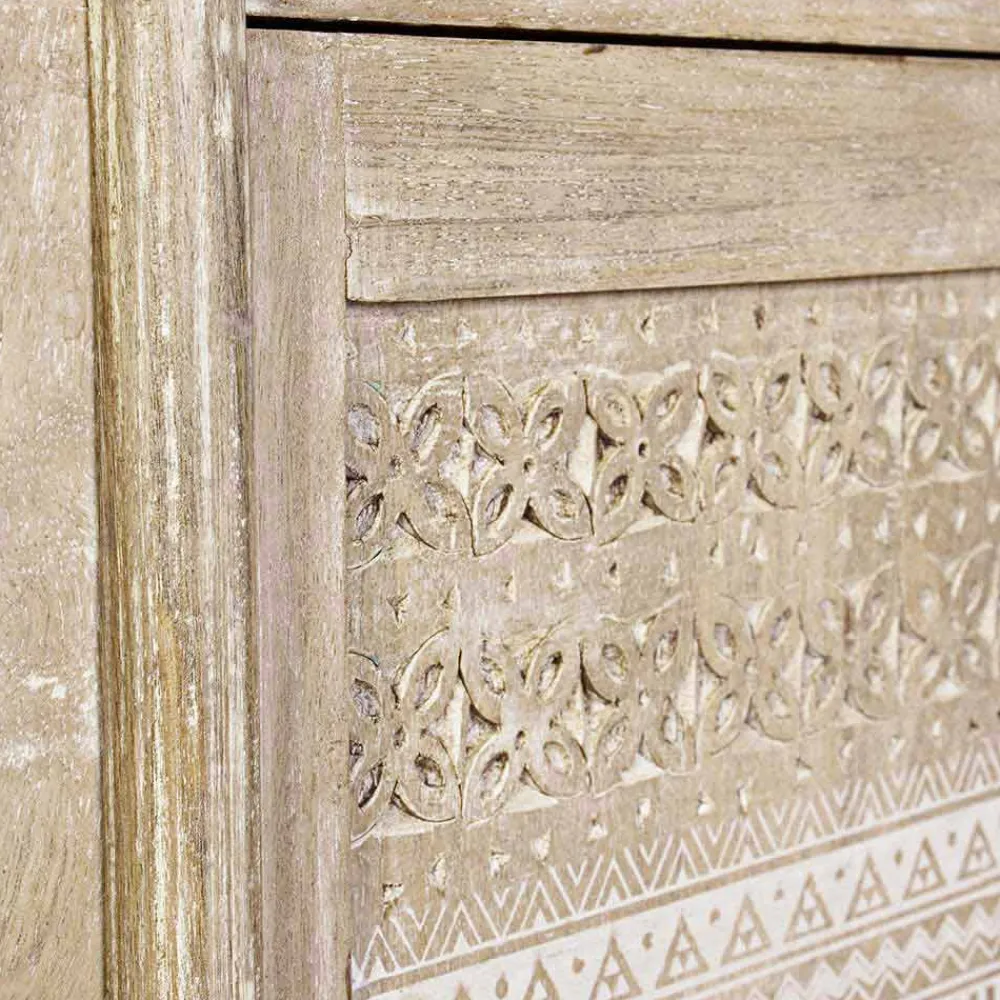 Niedriger Schrank mit Struktur aus Mangoholz mit handgefertigten Dekorationen.