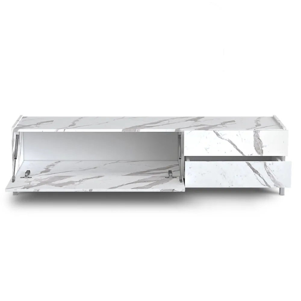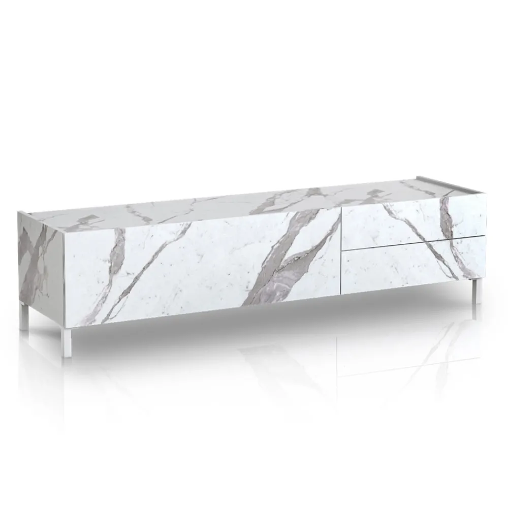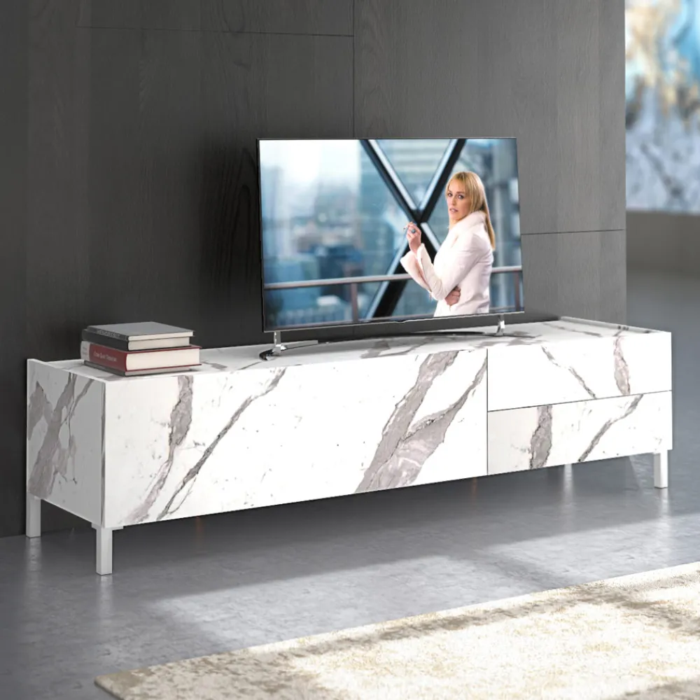 TV-Schrank aus ökologischen Holzspanplatten mit einer Dicke von 15/16 mm, vollständig mit Melamin mit mattem Calacatta-Weiß-Marmor-Finish überzogen , mit 1 Falttür, 2 Schubladen und verstellbaren Füßen , komplett .