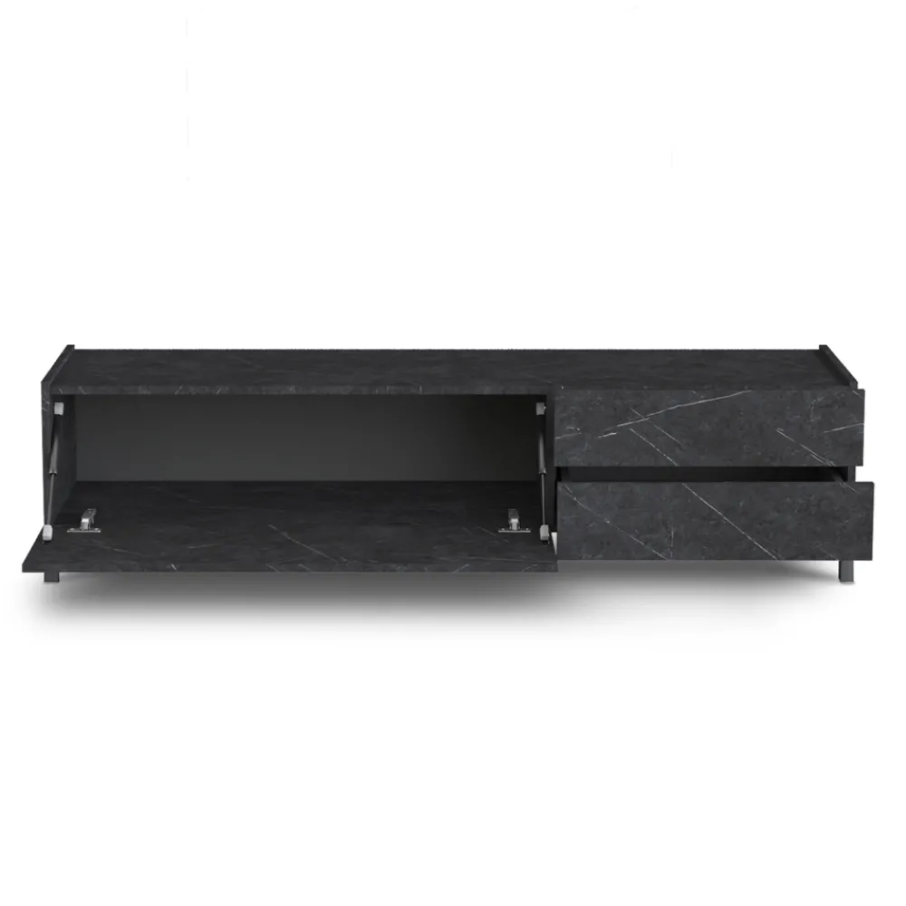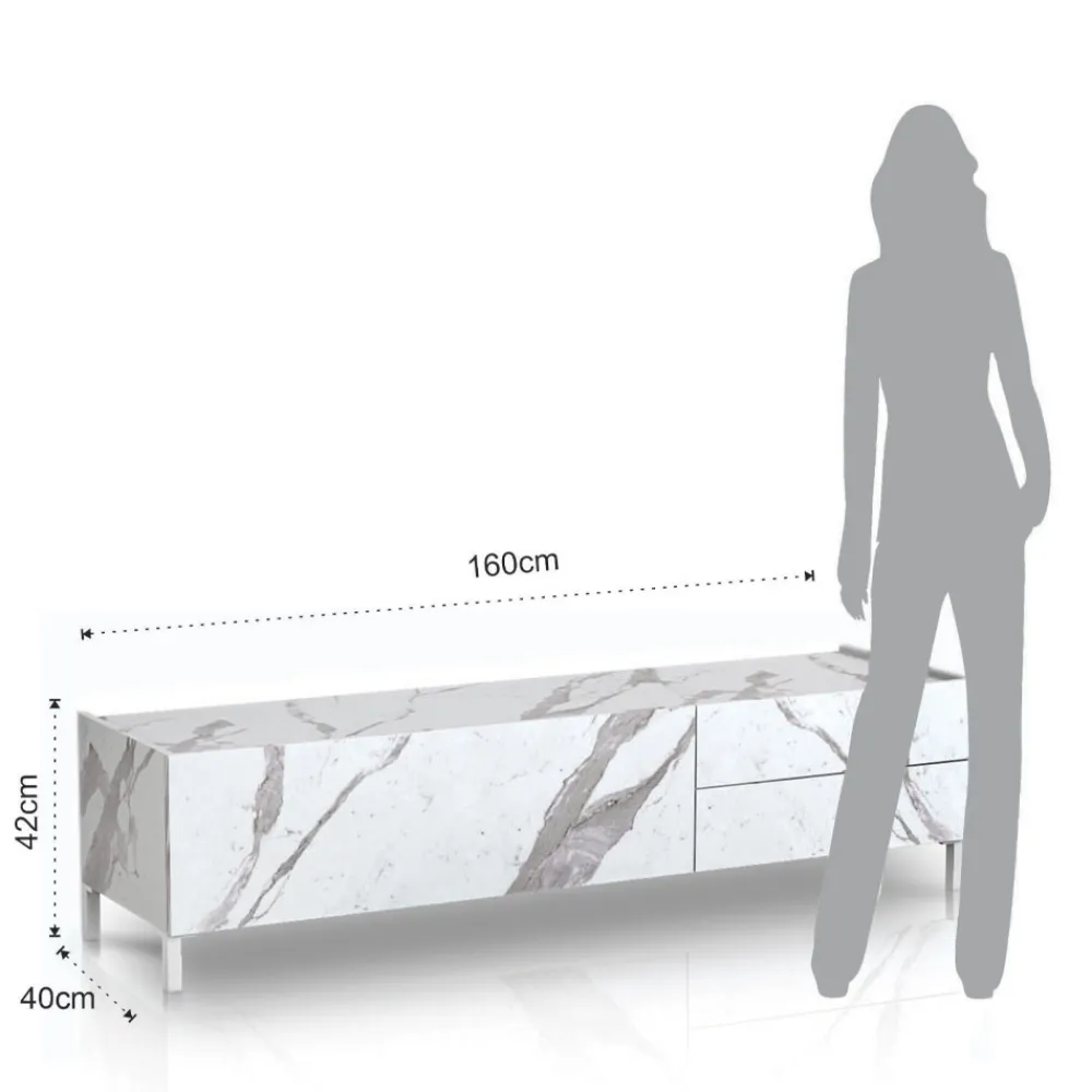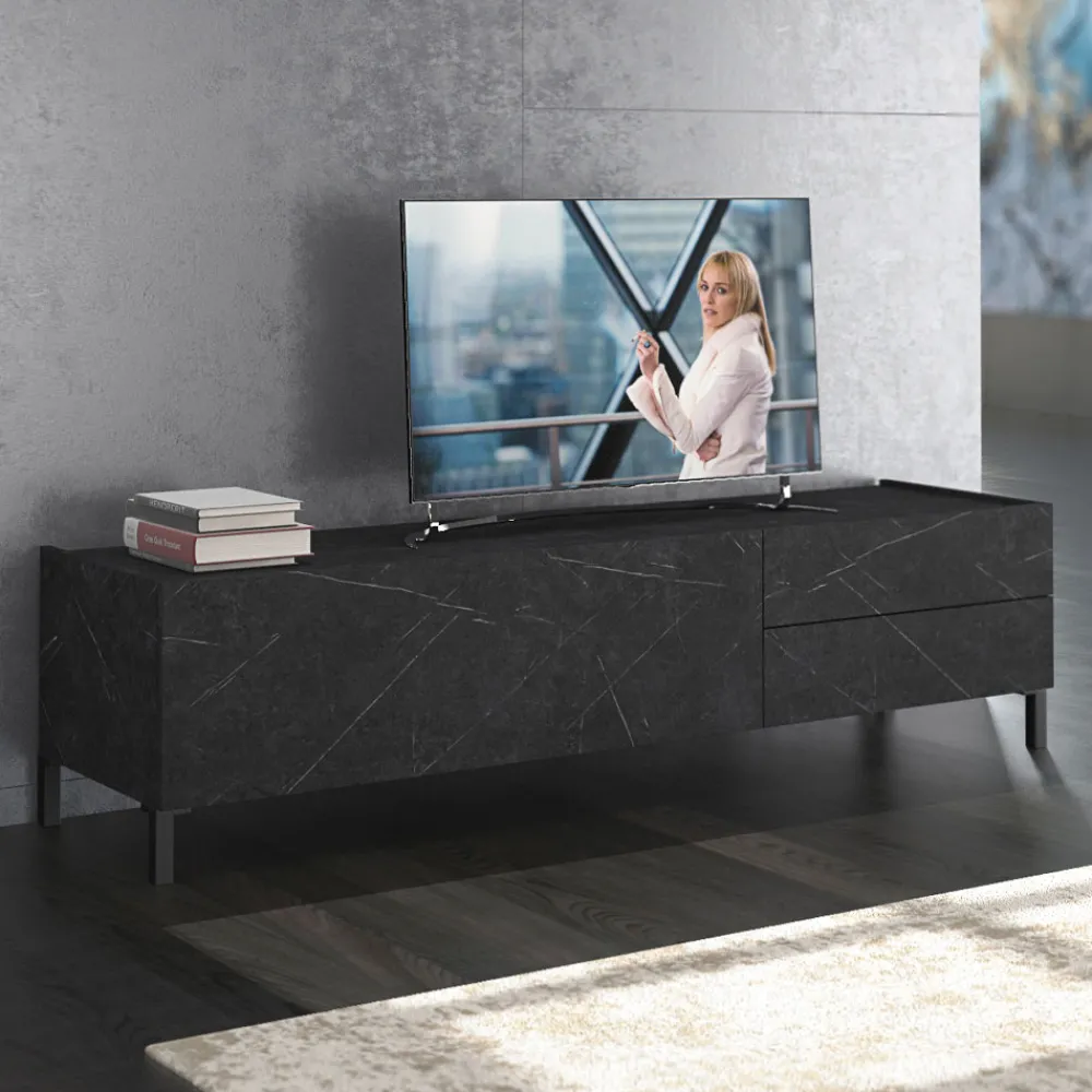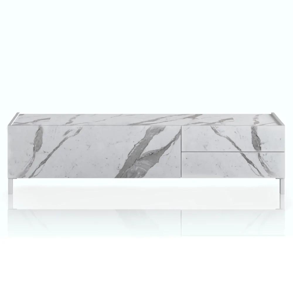 TV-Schrank aus ökologischen Holzspanplatten mit einer Dicke von 15/16 mm, vollständig mit Melamin mit mattem Calacatta-Weiß-Marmor-Finish überzogen , mit 1 Falttür, 2 Schubladen und verstellbaren Füßen , komplett .