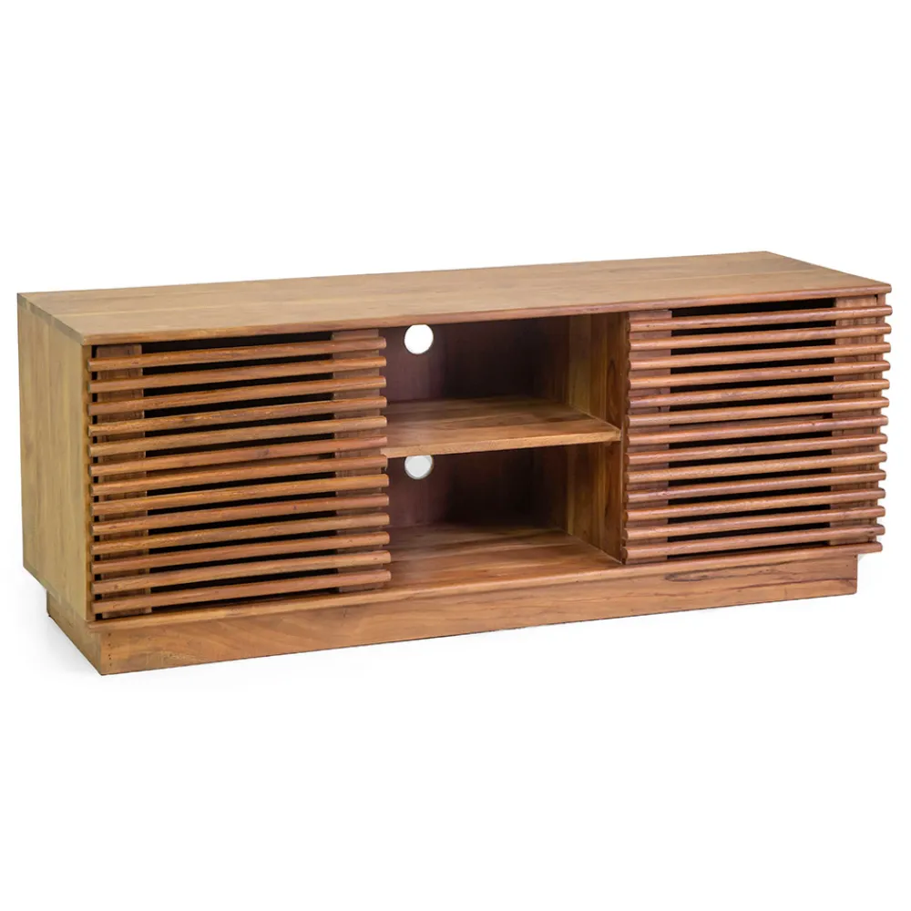 Verleihen Sie Ihrem Wohnzimmer einen Hauch natürlicher Eleganz mit diesem atemberaubenden TV-Ständer aus Akazienholz. Sorgfältig handgefertigt, zeichnet sich das Design durch moderne Linien und einzigartige Details wie die Lattentüren aus, die Ihrem Raum Tiefe und Stil verleihen.