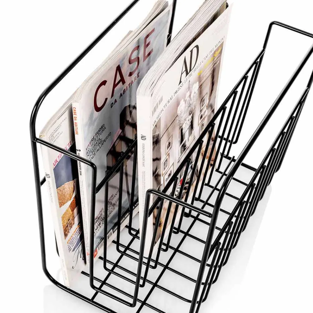 Dieser Zeitschriftenständer ist eine ideale Lösung für alle, die ein Objekt mit minimalistischem Design benötigen, das aber seine Funktion einwandfrei erfüllt. Seine Struktur besteht vollständig aus mattschwarz lackierten Metalldrähten und lässt sich dank seiner schlichten Linien perfekt mit den unterschiedlichsten Möbelstilen kombinieren, von den modernsten bis zu den klassischsten.