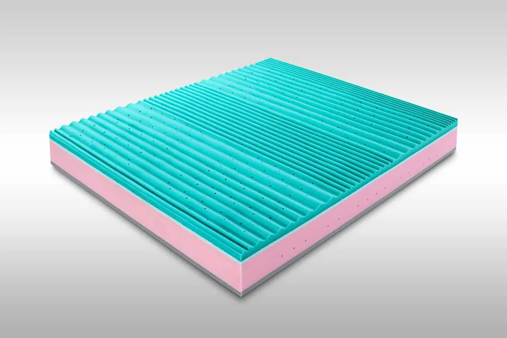 - 4,5 cm Memory Aloe Feel Green Dichte 50 kg/m3+1,5 cm Dichte 30 kg/m3 hellblauer Schaum;