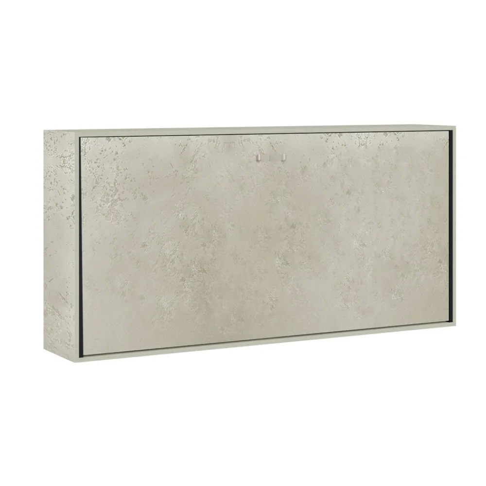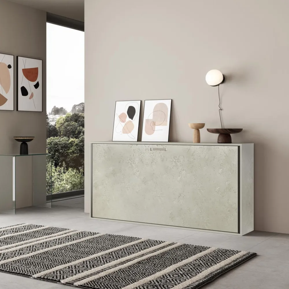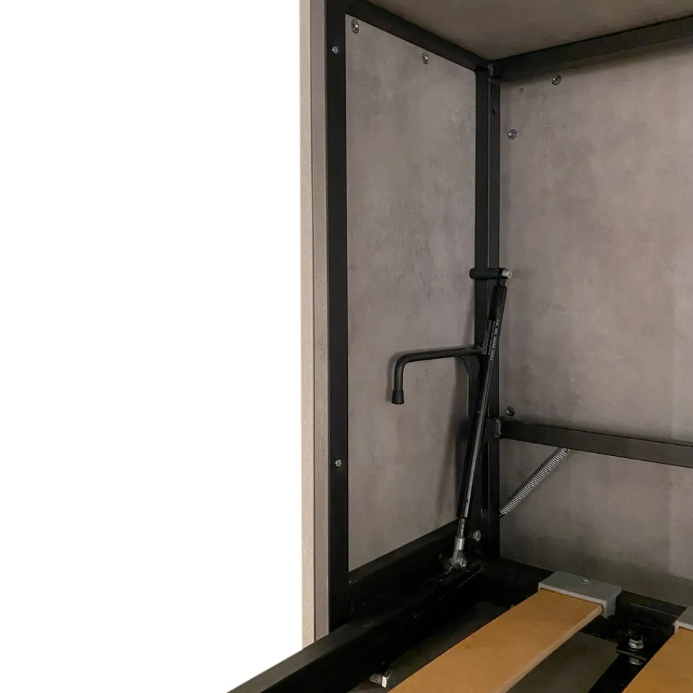 Horizontales Klappbett mit einer Struktur aus 18 mm dicken, veredelten Spanplatten, Bettuntergestell aus verstärktem, mit Epoxidpulver in geprägter Aluminiumfarbe lackiertem Eisen.