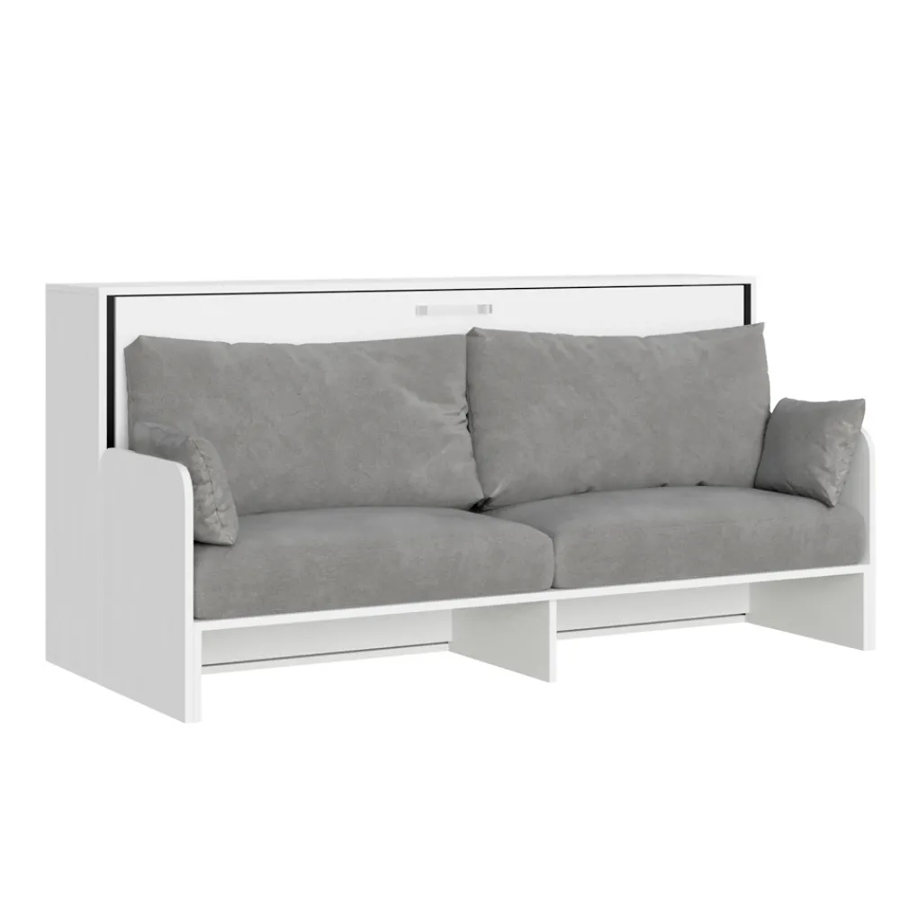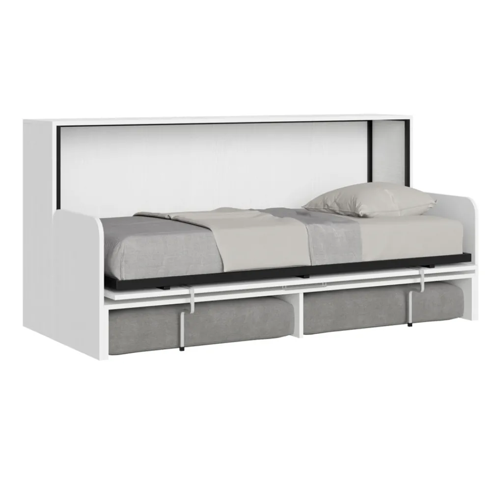 Horizontales Klappbett mit Bett- und Sofastruktur aus 18 mm dicker veredelter Spanplatte, Bettuntergestell aus verstärktem Eisen, lackiert mit Epoxidpulver in geprägter Aluminiumfarbe.