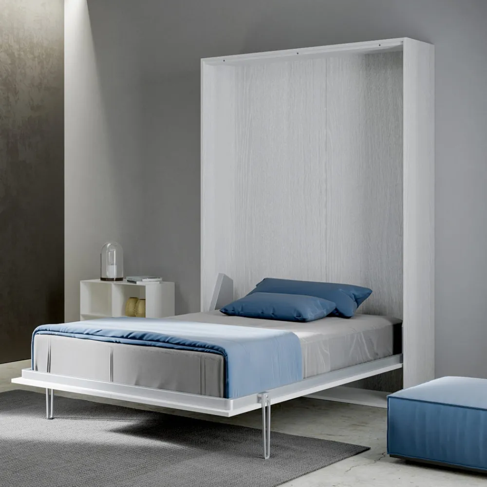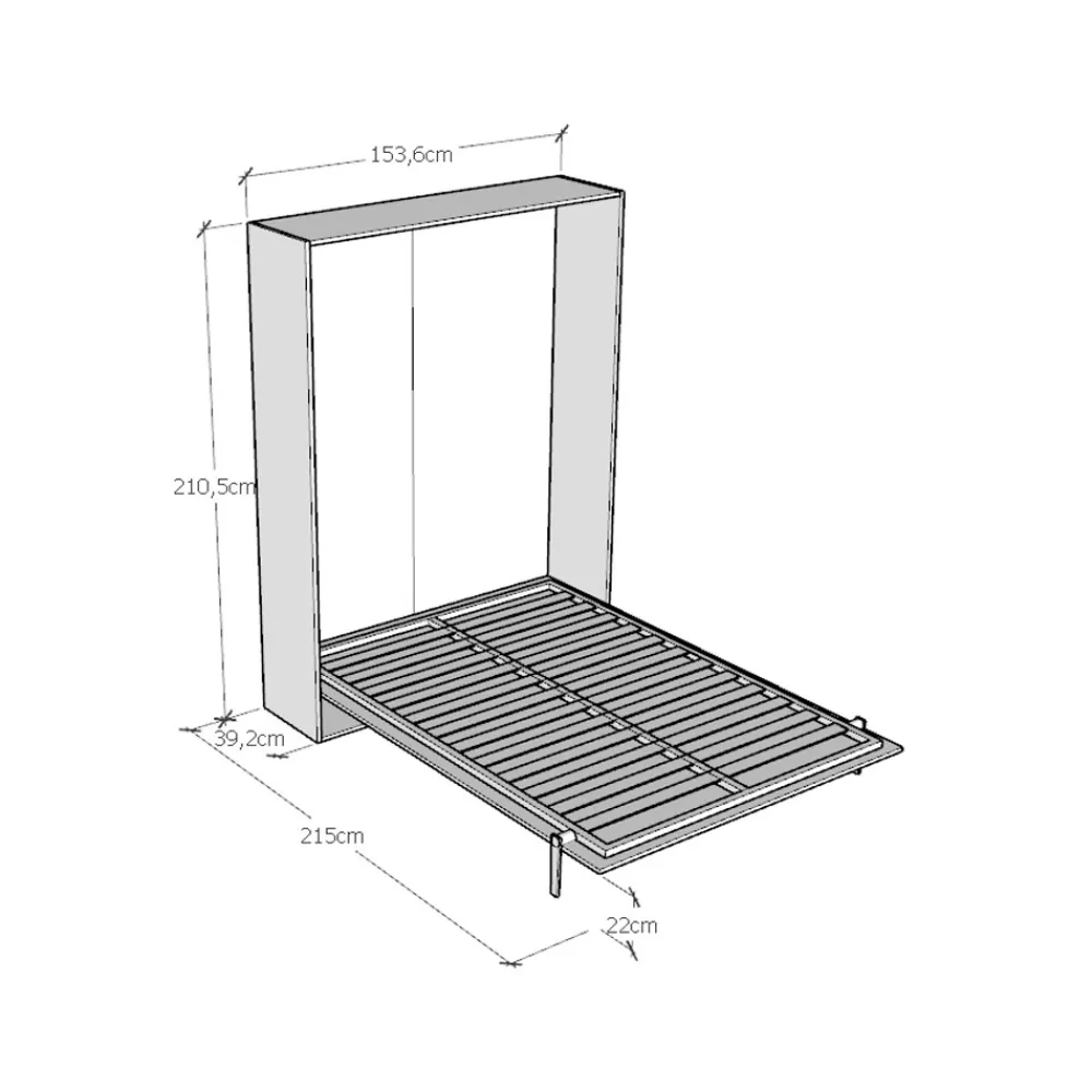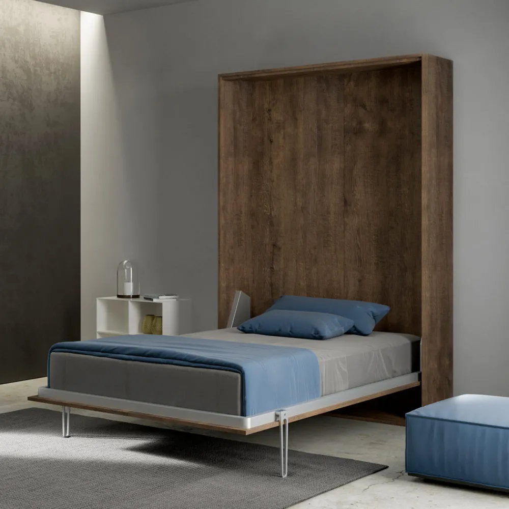 Der Bettrahmen besteht aus 18 mm dicken Melamin-Spanplatten und gewährleistet so Widerstandsfähigkeit und Langlebigkeit. Der Öffnungsmechanismus ist sanft und sicher und verwandelt die Wand mit einer einfachen Geste in ein bequemes Bett.