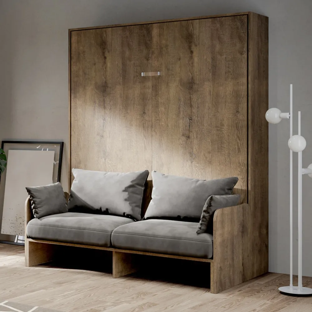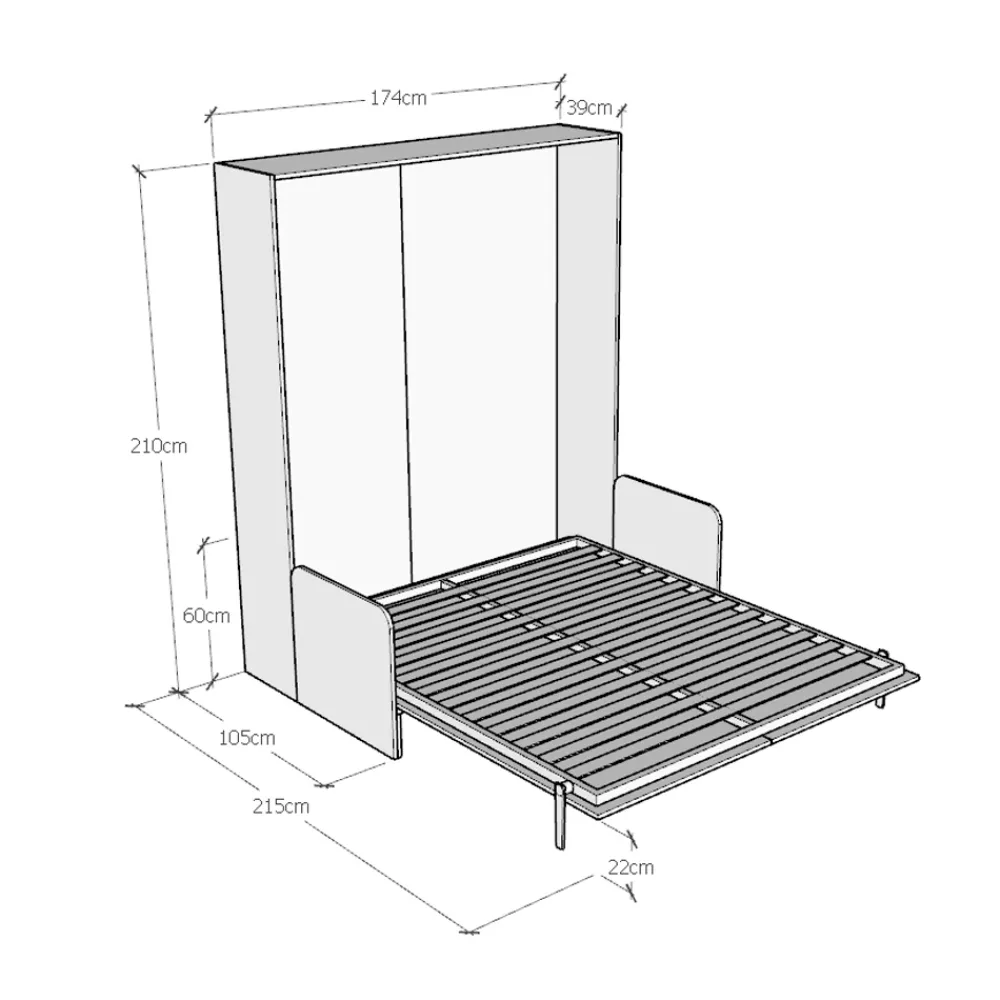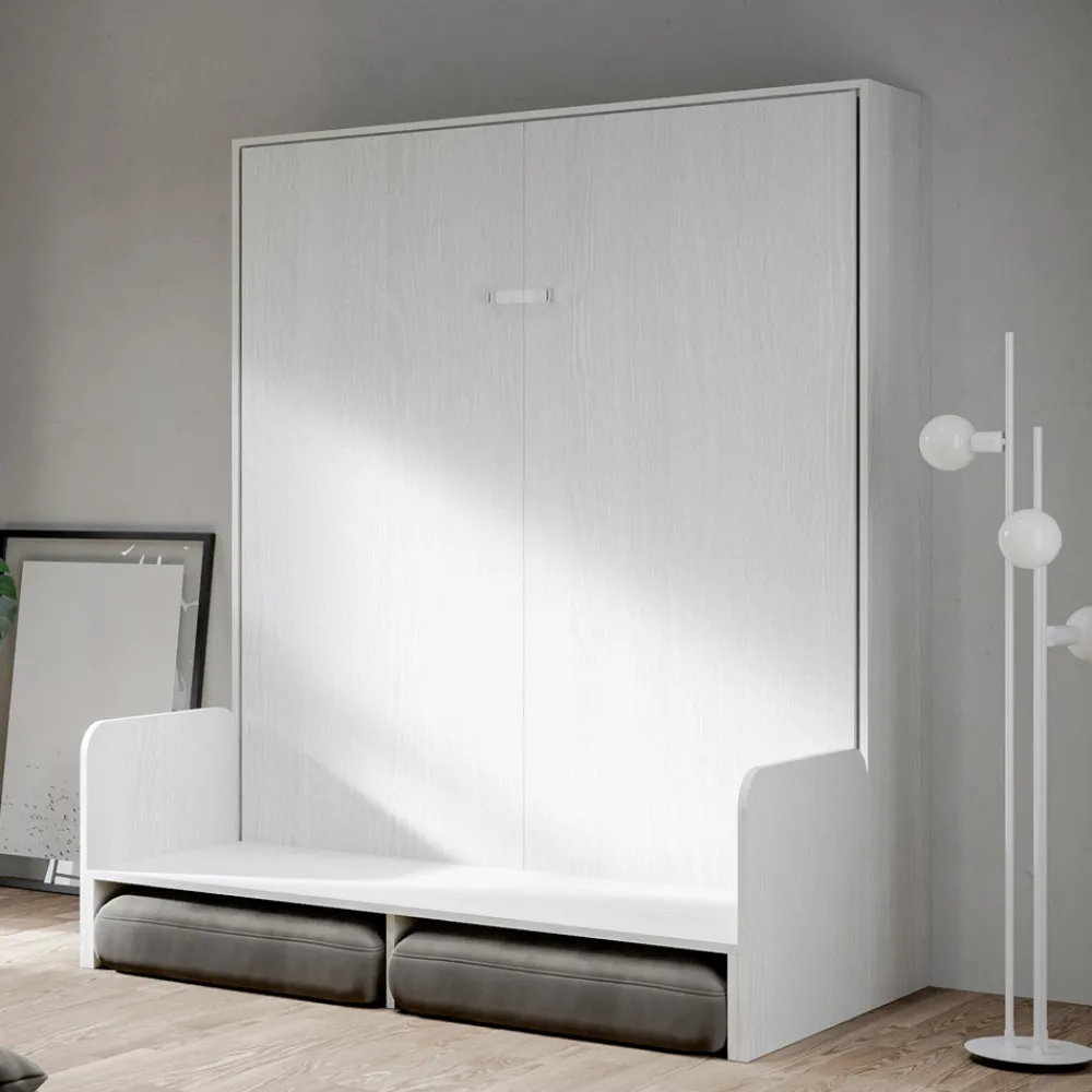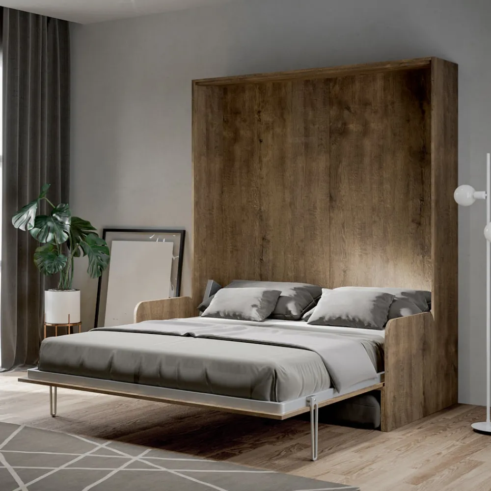 Der Bettrahmen besteht aus 18 mm dicken Melamin-Spanplatten und gewährleistet so Widerstandsfähigkeit und Langlebigkeit. Der Öffnungsmechanismus ist sanft und sicher und verwandelt die Wand mit einer einfachen Geste in ein bequemes Bett.