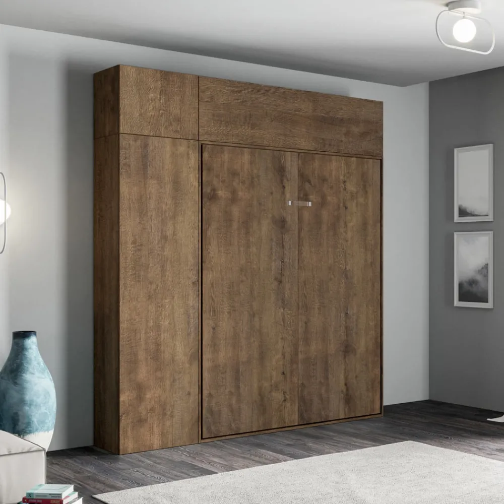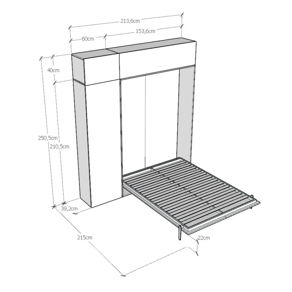 Der Bettrahmen besteht aus 18 mm dicken Melamin-Spanplatten und gewährleistet so Widerstandsfähigkeit und Langlebigkeit. Der Öffnungsmechanismus ist sanft und sicher und verwandelt die Wand mit einer einfachen Geste in ein bequemes Bett.
