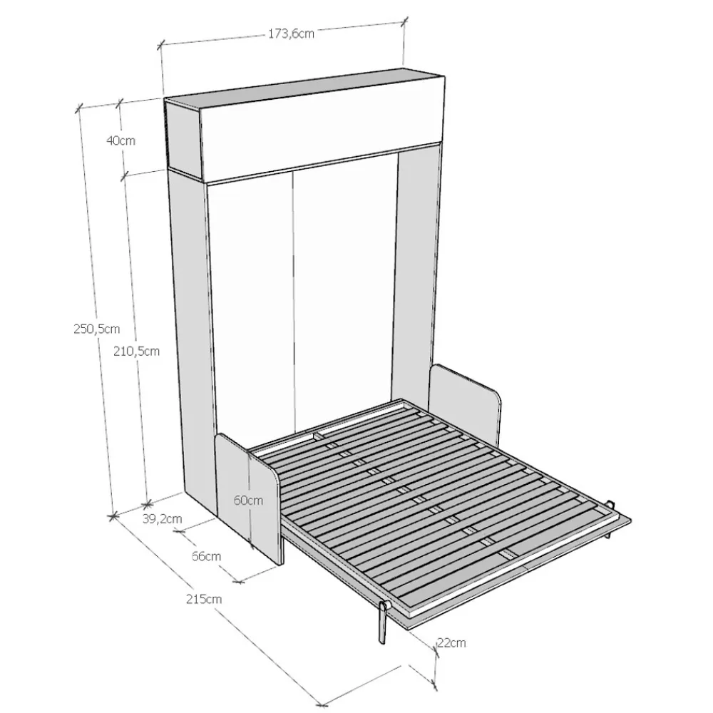 Der Bettrahmen besteht aus 18 mm dicken Melamin-Spanplatten und gewährleistet so Widerstandsfähigkeit und Langlebigkeit. Der Öffnungsmechanismus ist sanft und sicher und verwandelt die Wand mit einer einfachen Geste in ein bequemes Bett.