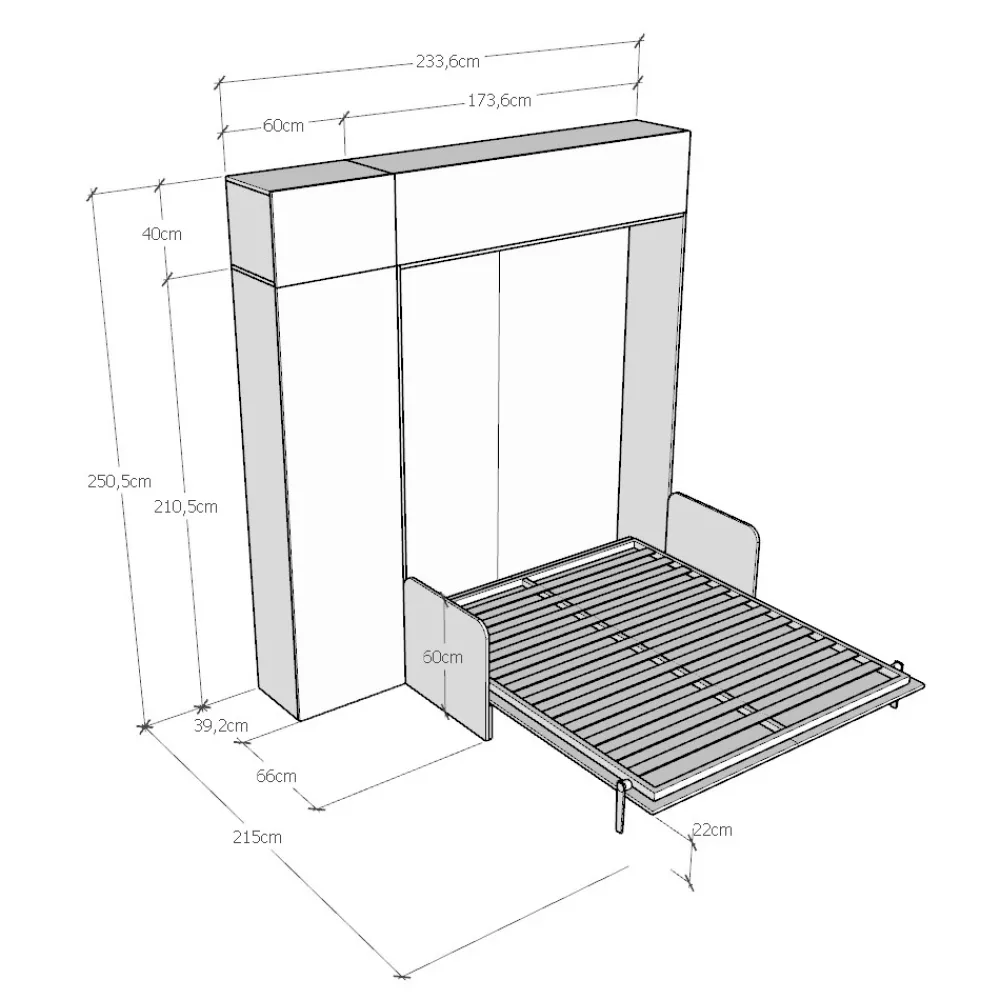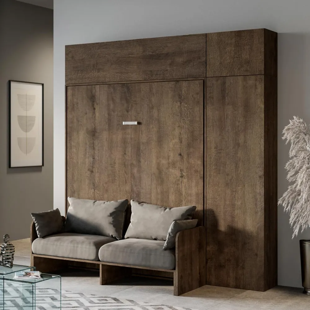 Der Bettrahmen besteht aus 18 mm dicken Melamin-Spanplatten und gewährleistet so Widerstandsfähigkeit und Langlebigkeit. Der Öffnungsmechanismus ist sanft und sicher und verwandelt die Wand mit einer einfachen Geste in ein bequemes Bett.