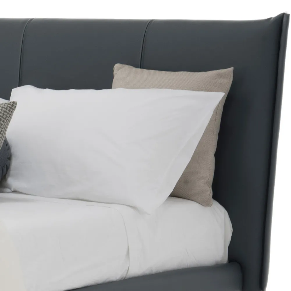 An den Seiten des Kopfteils befinden sich Frappe und in der Mitte der Nähte, die ihm Volumen und Weichheit verleihen; Das Kopfteil ist nicht abnehmbar . Der gerade Bettrahmen ist 27 cm hoch und abnehmbar . Die Füße sind aus Holz und 210 mm hoch.