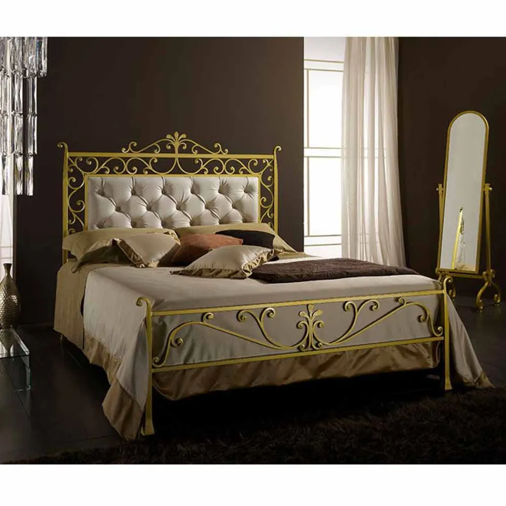 Das schmiedeeiserne Bett Giglio in der Variante DOPPELTES KOPFTEIL MIT FUSSTEIL UND SEITENLEISTEN umfasst die Einfügung eines 160 x 190 großen Bettgestells, das entweder von seinen eigenen Beinen getragen oder so angebracht werden kann, dass es auf dem Bettrahmen ruht. Diese zweite Lösung wird vom Unternehmen empfohlen, da sie das Bewegen und Reinigen erleichtert. In jedem Fall kann die Entscheidung, wie das Bettgestell angebracht werden soll, direkt bei der Montage getroffen werden und ist umkehrbar, da die Stützhalterungen in der Ausstattung des Betts enthalten sind. Falls besondere Anforderungen in Bezug auf die körperliche Konformation, die Kombination mit vorhandenen Bettgestellen oder einfach aus ästhetischen Gründen bestehen, kann dieses Modell dank unserer handwerklichen Produktivität in Höhe, Länge und Breite verändert werden.