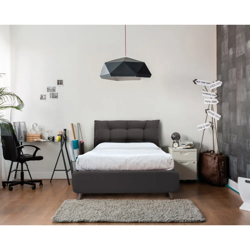 Modell mit Standardbehälter : gepolsterter Bettrahmen mit unterstützter Basis und bequemem 11 cm hohen Fuß, der die Reinigung unter der Struktur ermöglicht. Behälter mit schräger Öffnung, die die Zweckmäßigkeit eines großen Fachs mit unglaublicher Kapazität bietet.