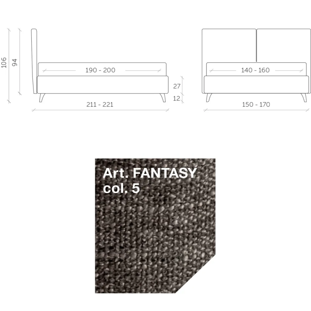 Doppelbett mit dynamischem Untergestell , Bettkasten, Metallfüßen mit poliertem Stahlfinish (Höhe 12 cm) und Kopfteil dank einer speziellen Polsterung aus feuerfestem Stoff. Das Kopfteil ist eine Monocoque-Konstruktion, die in der Mitte zweigeteilt ist und eine leichte Schräge aufweist, die eine besonders saubere und angenehme Linie bietet.