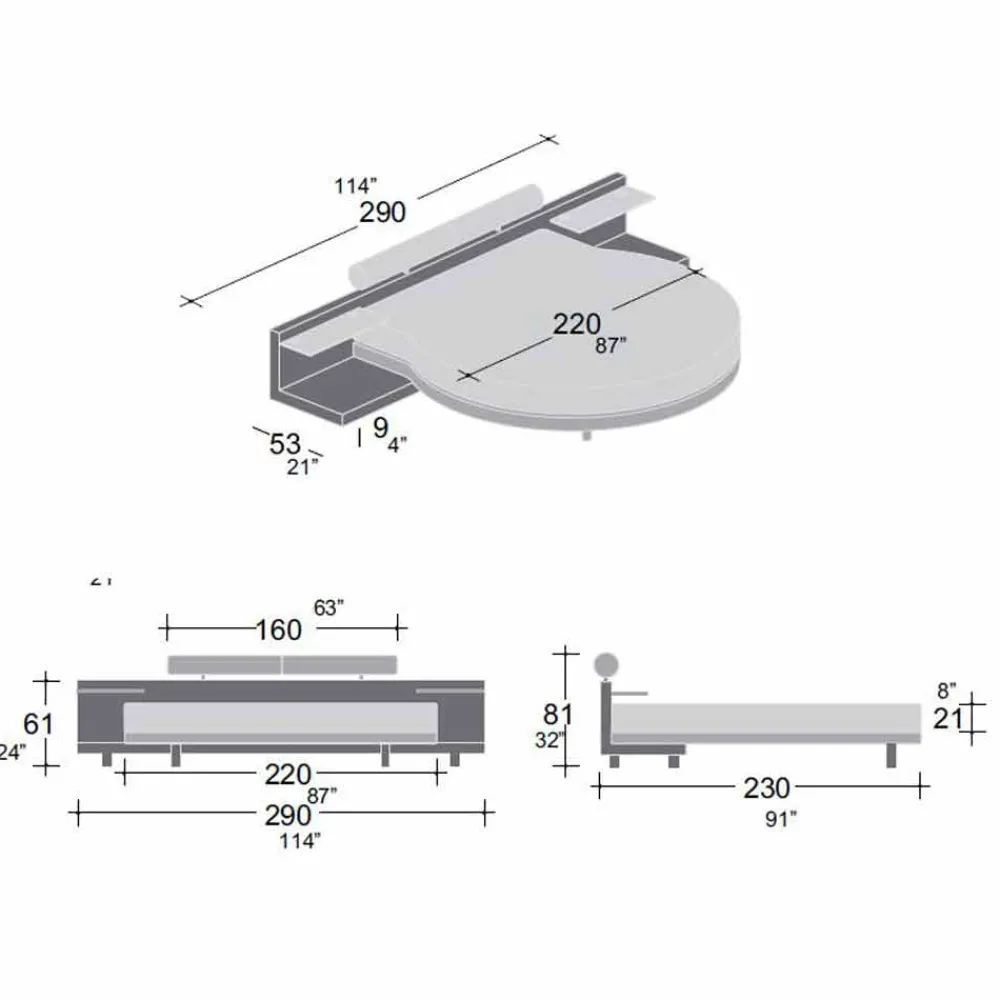 Maße Kopfteil : L 290 x T 53 cm.