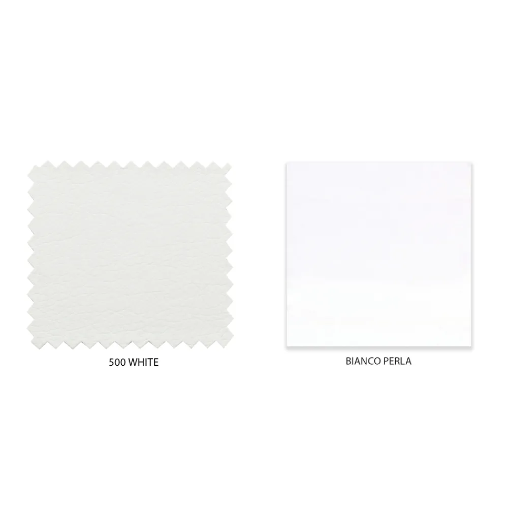 Doppelbett mit einer Struktur aus mitteldichten Holzfaserplatten (MDF) , bezogen mit weißem Ökoleder und grauen Füßen aus Polypropylen . Bei der Containervariante bestehen die Containerböden aus hochdichten Faserplatten (HDF) aus hochverdichtetem Holzpressling .