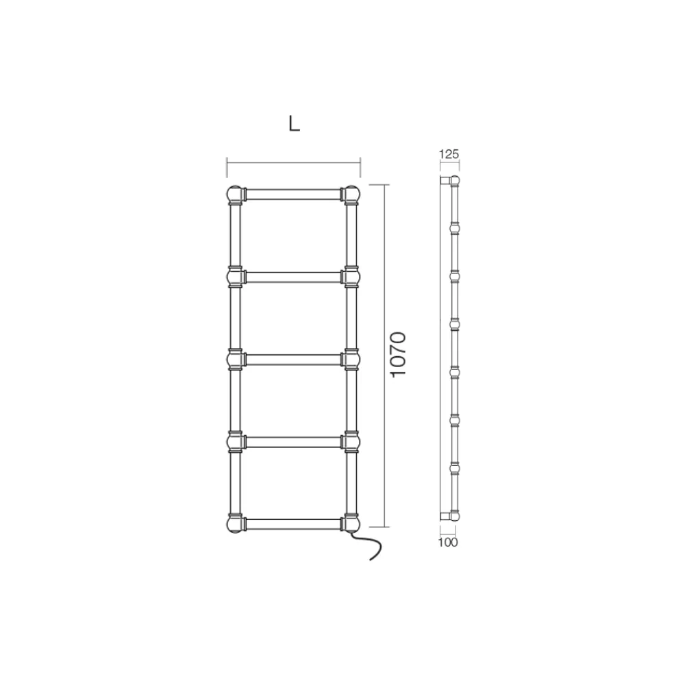 Elektrischer Handtuchwärmer aus goldfarbenem Messing mit Elementen mit 3 cm Durchmesser und Verbindungskugeln, vollständig in Italien hergestellt, inklusive Wandbefestigungsset . Elektrifizierungssatz unten rechts positioniert.