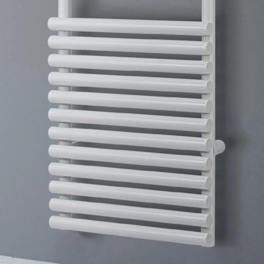 Elektrischer Handtuchwärmer aus Kohlenstoffstahl mit rein glänzender weißer Oberfläche, bestehend aus einer Reihe horizontaler Elemente mit einem Durchmesser von 3,5 cm, die an vertikale Verteiler mit einem Durchmesser von 3,5 cm geschweißt sind, vollständig in Italien hergestellt, inklusive Wandbefestigungsset . Elektrifizierungssatz unten rechts positioniert.