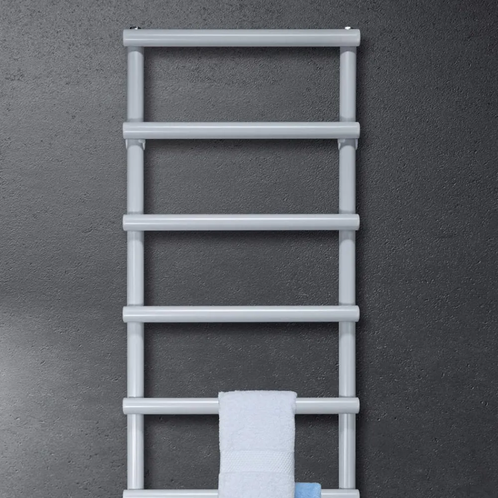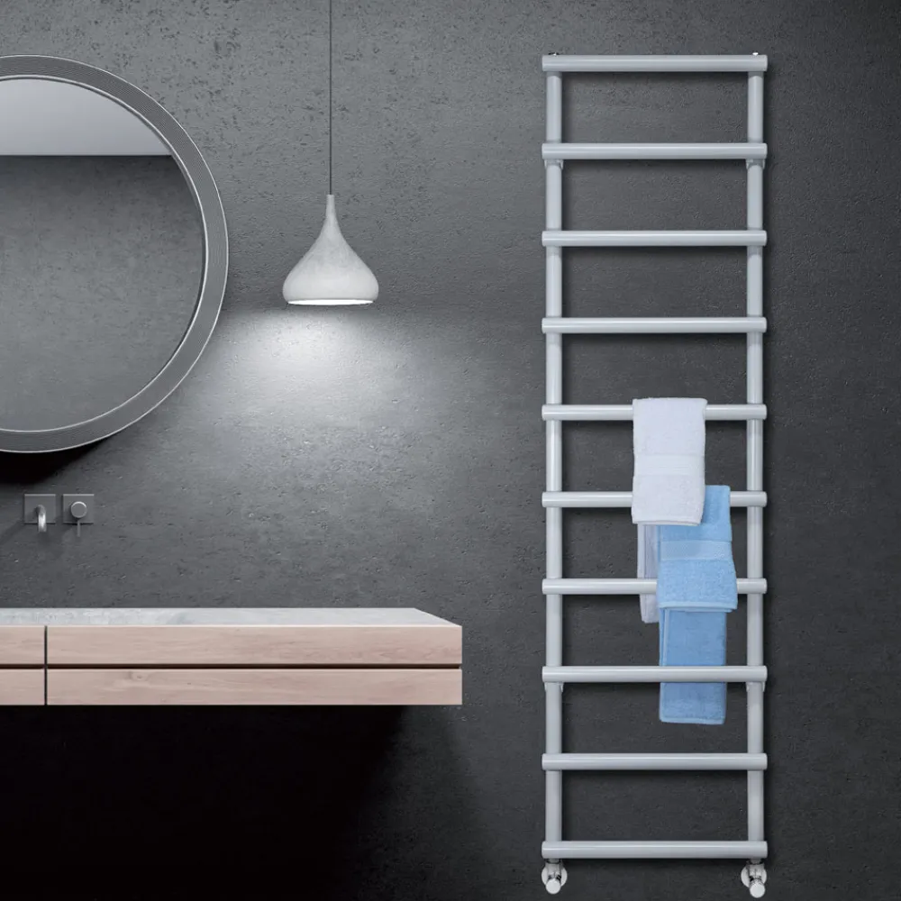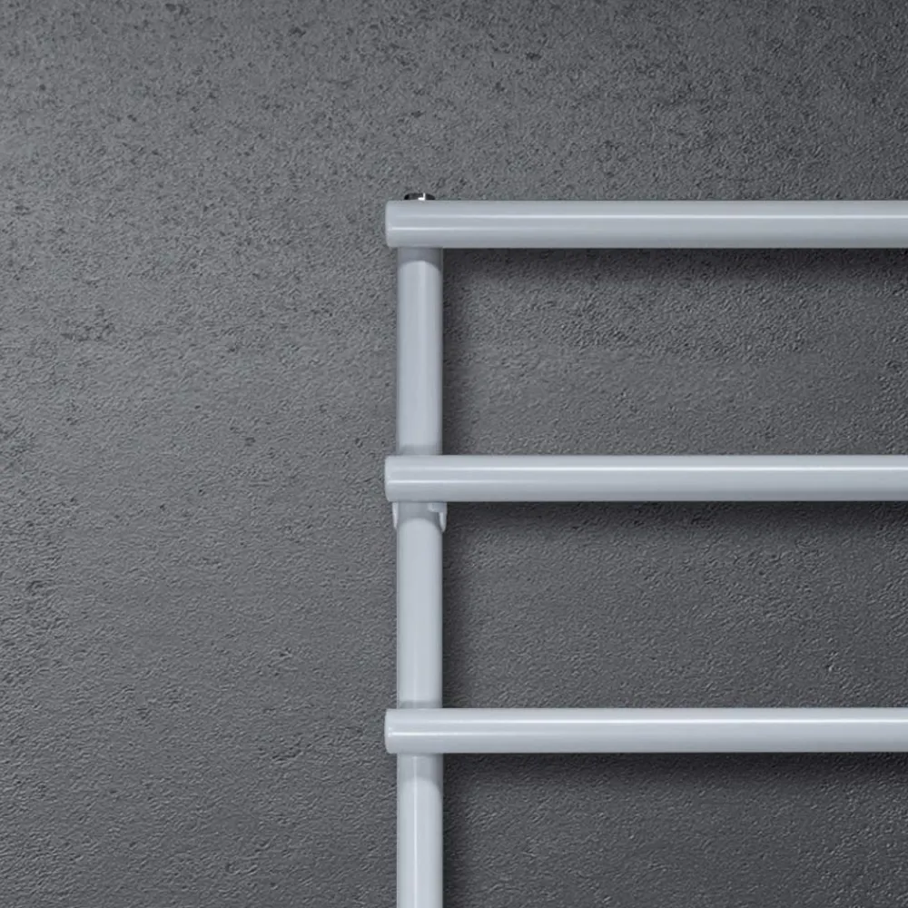 Hydraulischer Handtuchwärmer aus Kohlenstoffstahl mit hellgrauer Oberfläche , bestehend aus einer Reihe horizontaler Elemente mit einem Durchmesser von 3,5 cm, die an vertikale Verteiler mit einem Durchmesser von 3,5 cm geschweißt sind. Komplett in Italien hergestellt, inklusive Wandbefestigungsset, Entlüftungsventil und Blindstopfen .