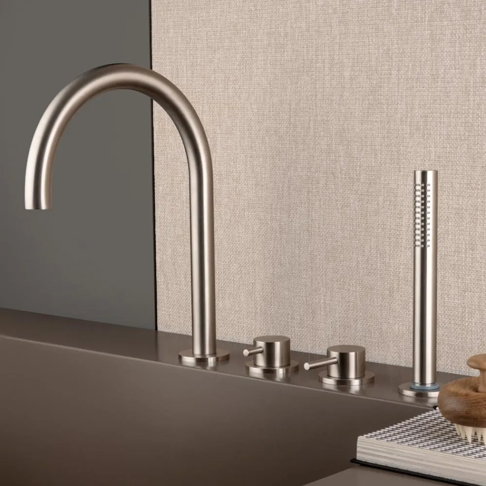 4-Loch-Wannenrandmischer mit Auslauf und 4-Loch-Brausegarnitur aus Edelstahl AISI 316L , 100 % recycelbares Material, vollständig in Italien hergestellt.