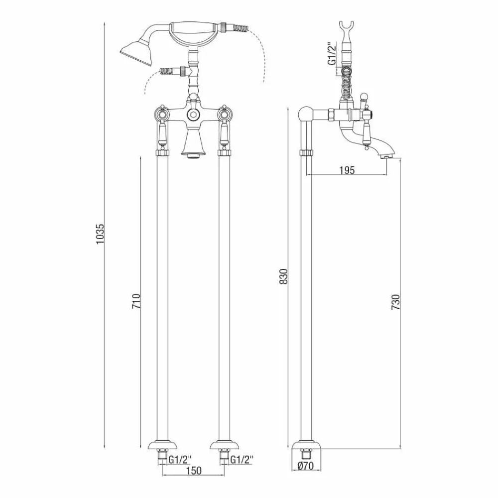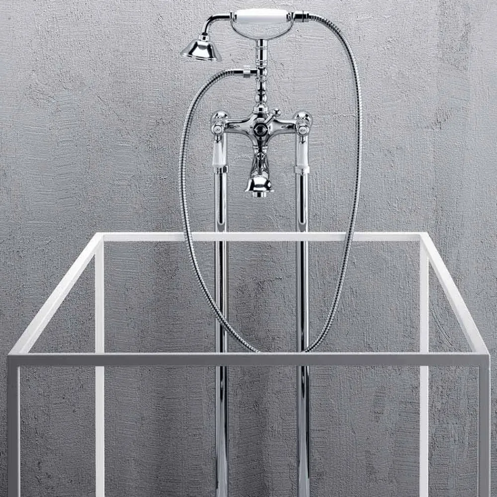 Bademischer auf Bodensäulen mit Messingdusche , 1500 mm flexiblem Schlauch und rechter und linker Schraube.