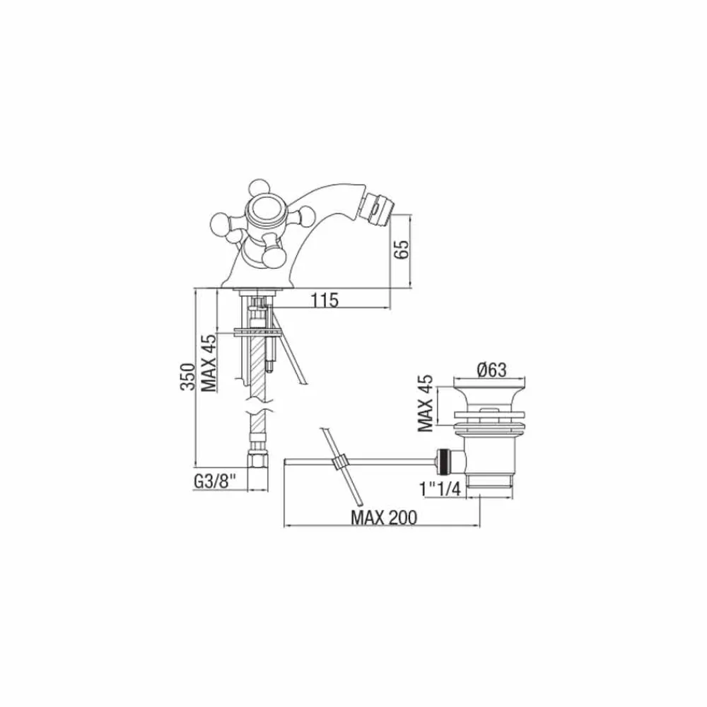 Klassischer Einlochmischer für Bidet aus Messing mit Made in Italy Abfluss.