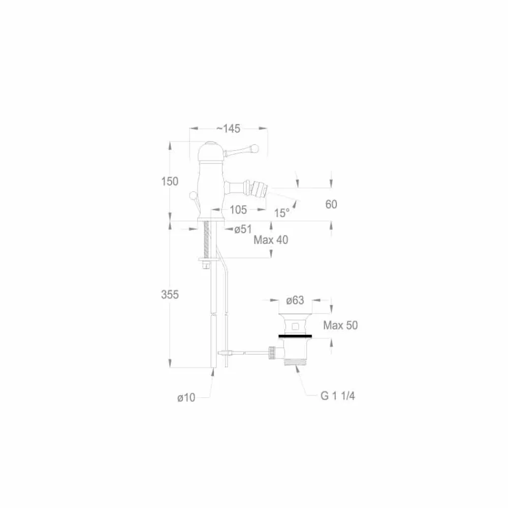 Klassischer Bidet-Mischpult aus verchromtem Messing mit einer Höhe von 150 mm und einem Achsabstand von 105 mm, mit Ablauf und Zugstange.
