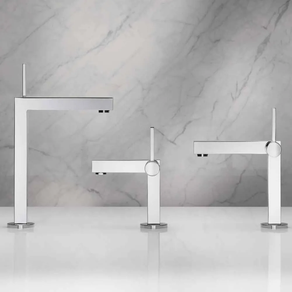 Diese wundervolle und elegante Linie von Badarmaturen kombiniert runde und quadratische Formen, um eine einzigartige und luxuriöse Umgebung zu schaffen. Dieses Einrichtungszubehör zeichnet sich durch präzise Konturen und extrem helle Oberflächen dank der Verchromung des Messing aus und repräsentiert ein exklusives Design, das Ihre Möbel auf elegante und raffinierte Weise revolutionieren kann.