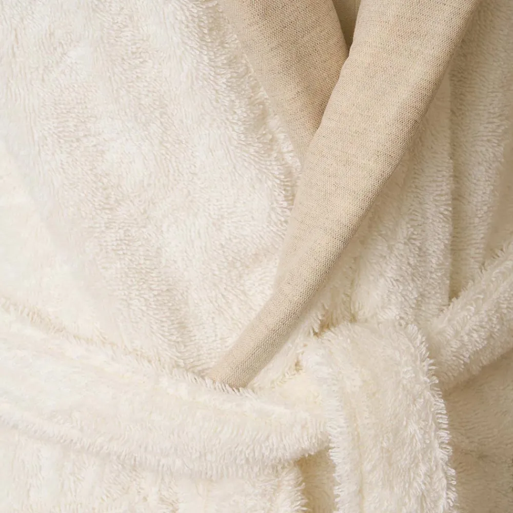 Bademantel mit Schalkragen aus 90 % reinem Baumwollfrottee, 430 g/m2, elfenbeinfarben, mit Volant aus reinem Leinen.