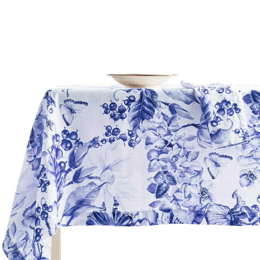 Tischdecke aus reinem Leinen, bedruckt und gewaschen, mit üppigem Blumenmuster.