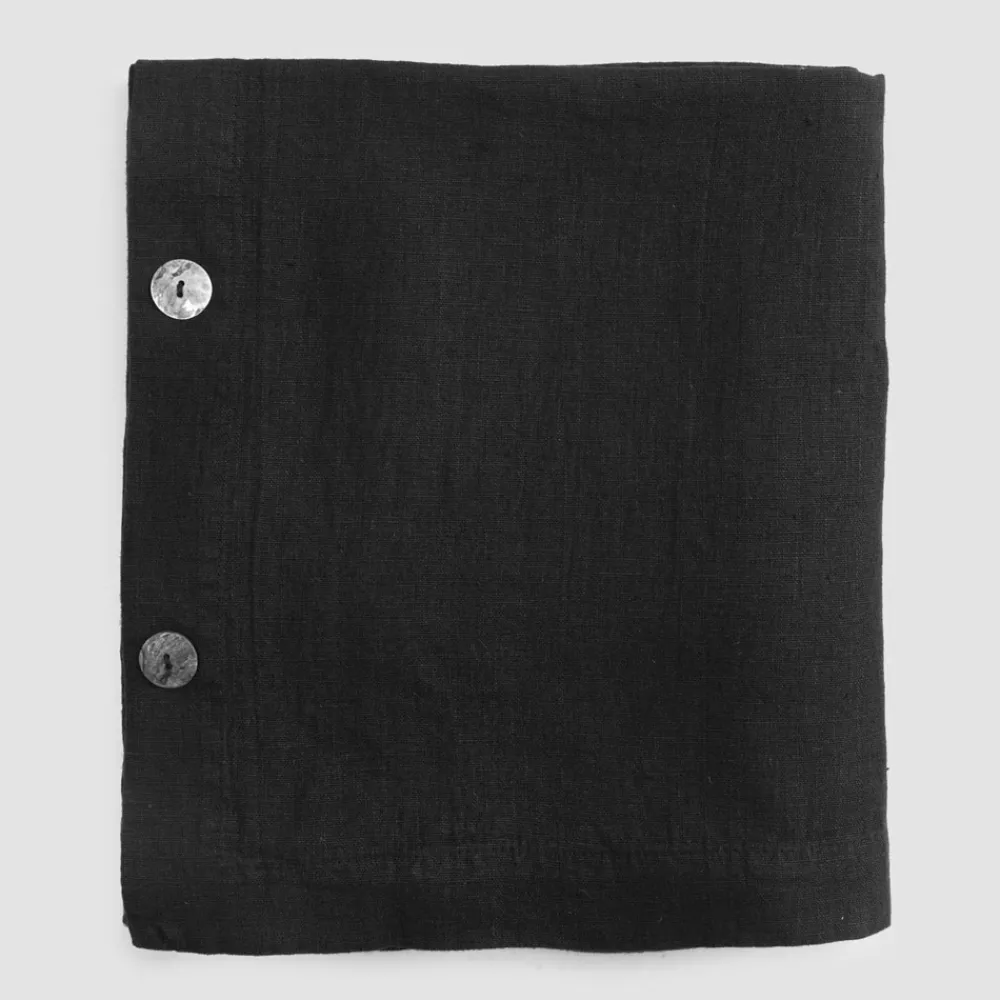 Der Wert der Tradition verbindet den modernen Lebensstil mit dieser schweren Leinentischdecke, die auf einer langen Seite mit einer Reihe von Agoya-Perlmuttknöpfen verziert ist.
