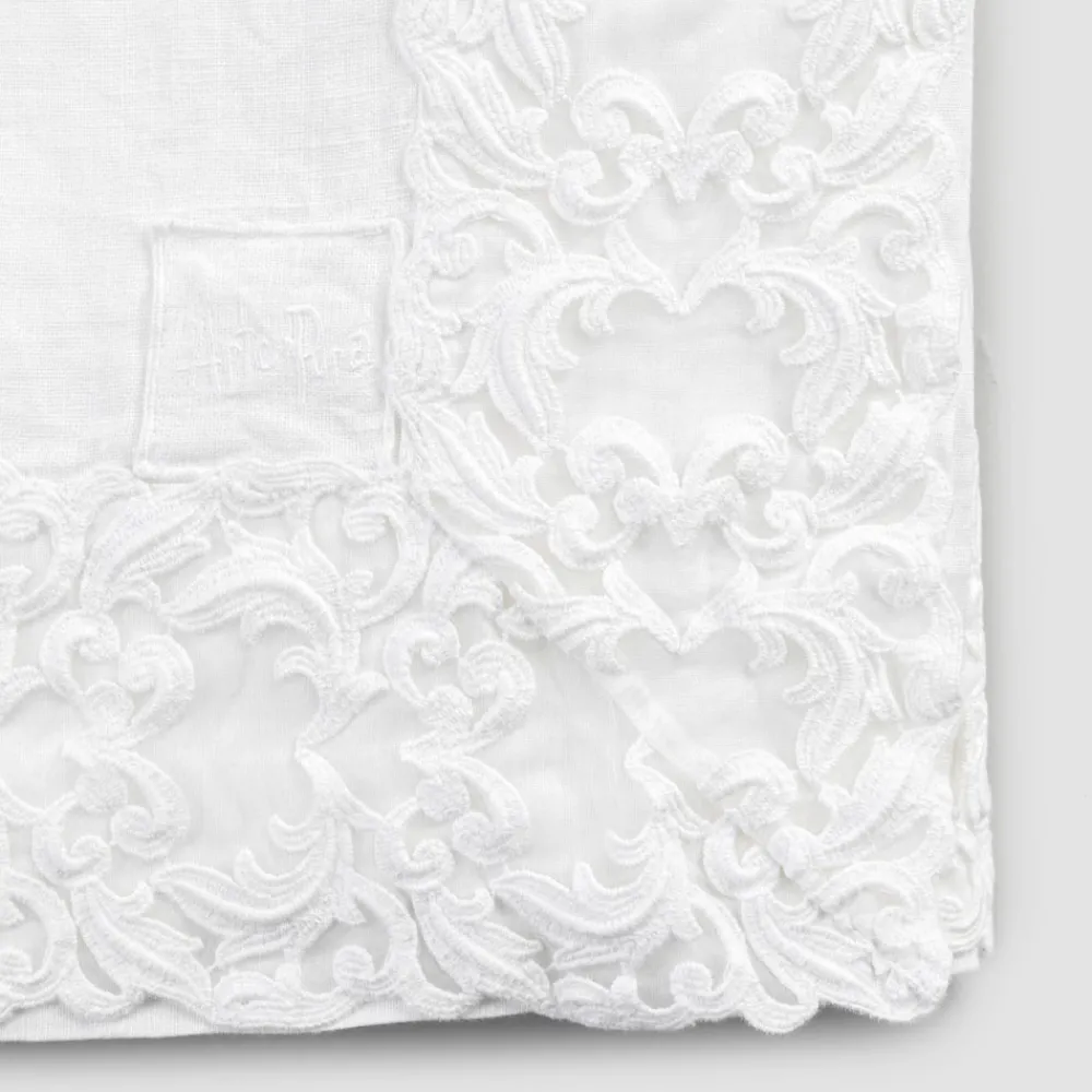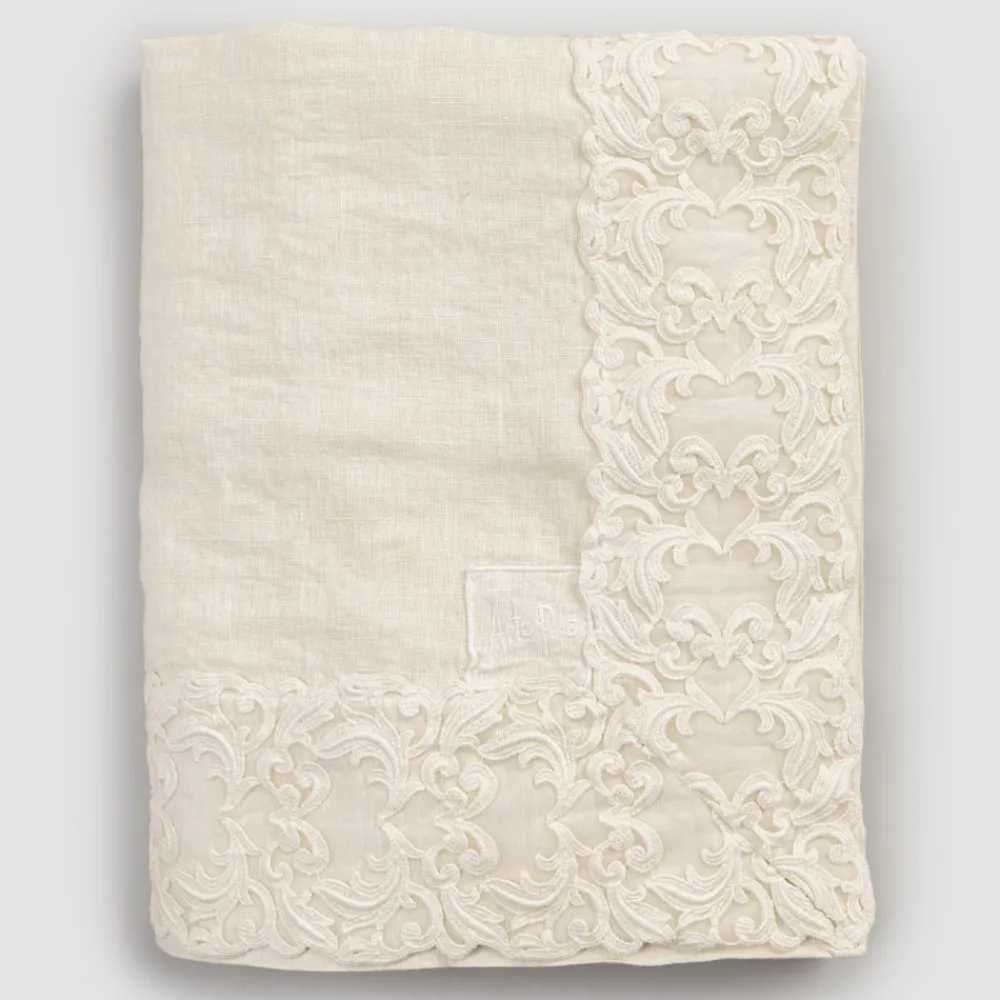 Der Wert der Tradition verbindet den modernen Lebensstil mit dieser schweren Leinentischdecke, die in zwei Ausführungen erhältlich ist und mit Farnese-Spitze verziert ist, die auf den Rahmen aller Seiten und die gefaltete Kante genäht ist.