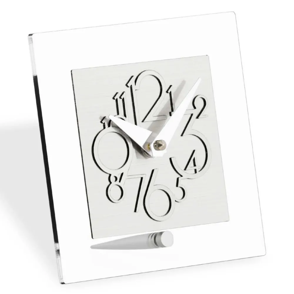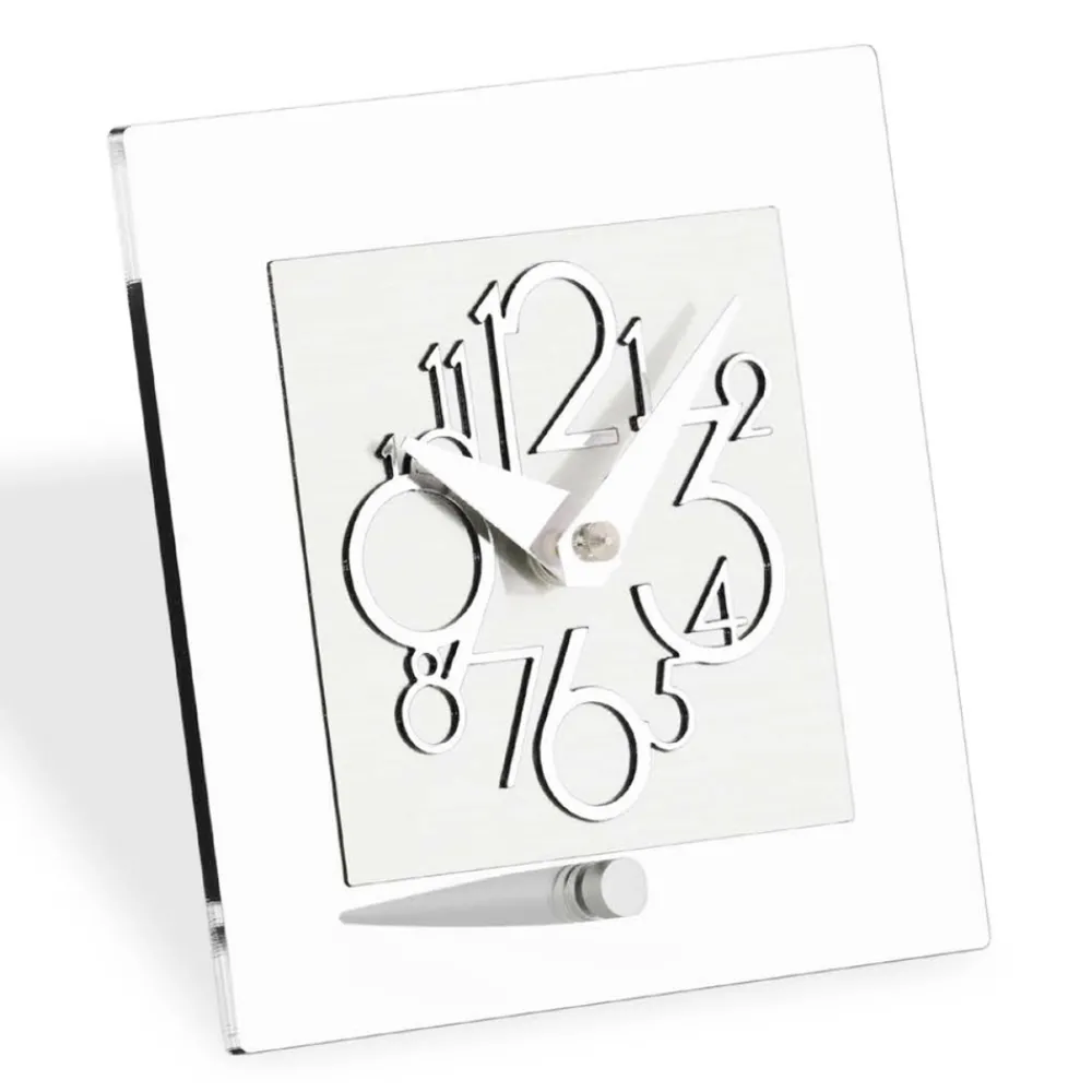 Tischuhr aus hochdichtem und reinem Bi-Satin-Methacrylat , geschnitten mit computergesteuerten High-Tech-Werkzeugen, vollständig in Italien hergestellt.