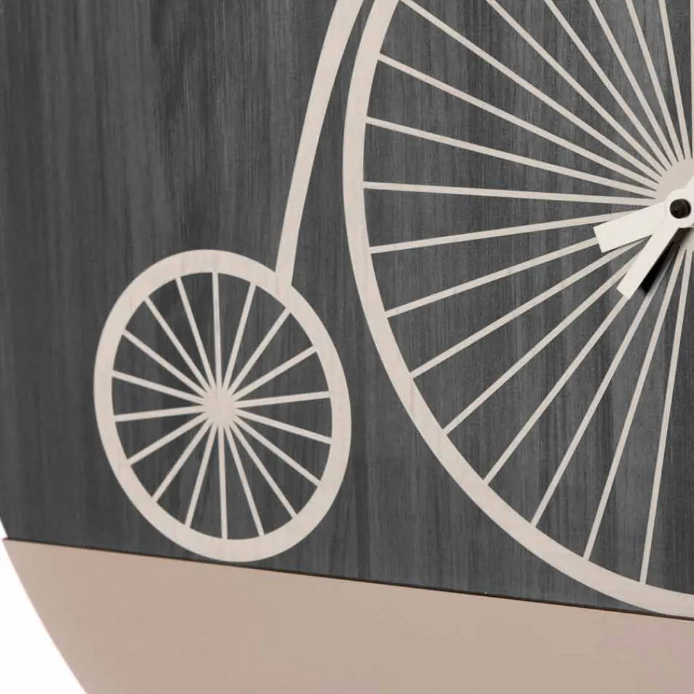 Wanduhr aus Tafel oder Eschenholz mit lasergezeichnetem Dekorationsfahrrad, hergestellt in Italien.