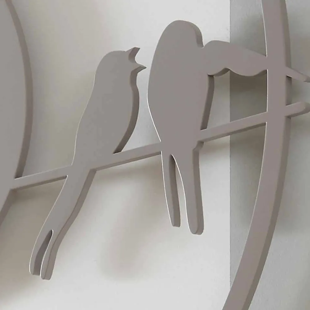 Große und originelle Wanduhr, rundes und modernes Design mit Vögeln, aus weißem, taupefarbenem oder grauem Holz, hergestellt in Italien.