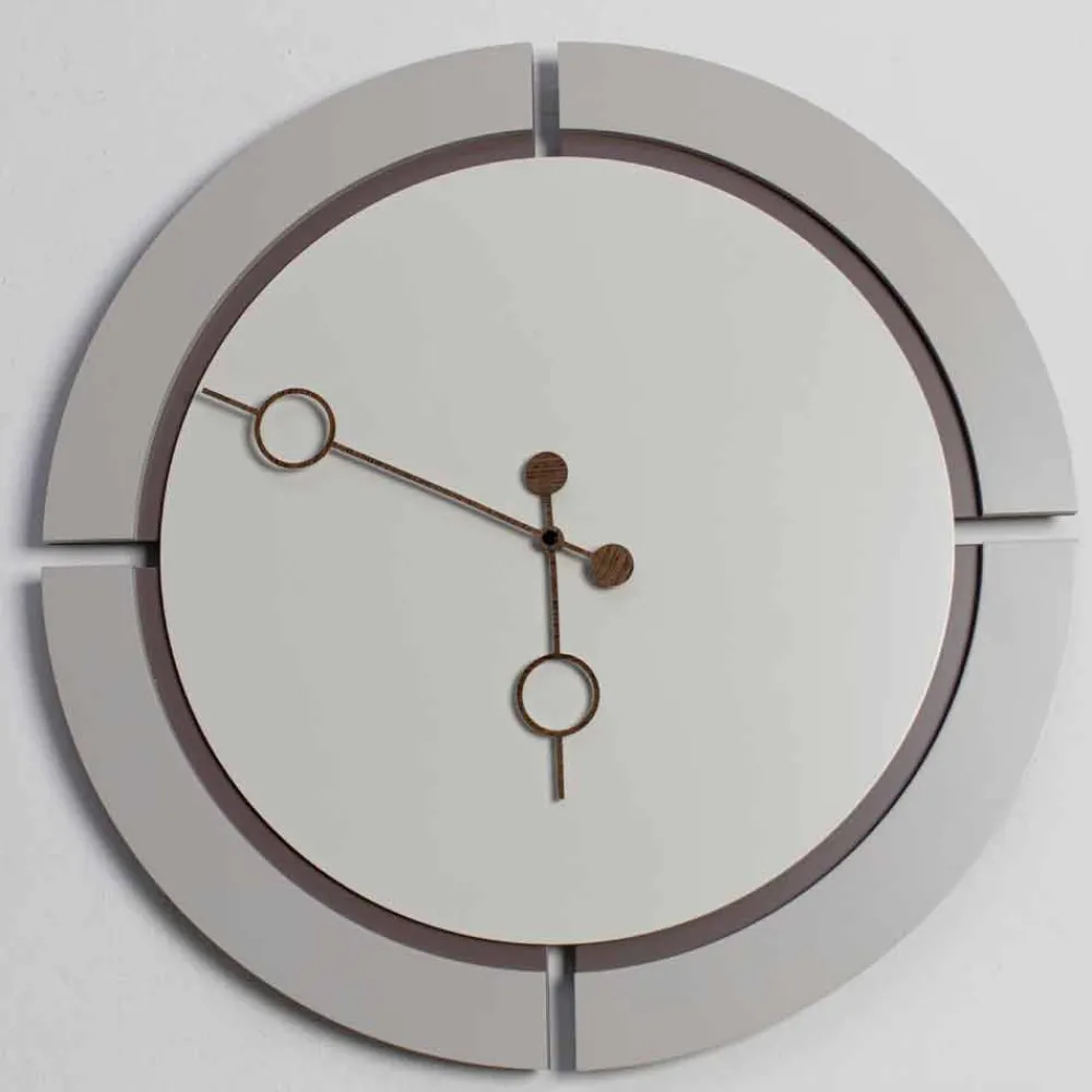 Runde Wanduhr aus braunem, beige und kakaolackiertem Holz mit Walnusszeigern, modernes Design made in Italy.