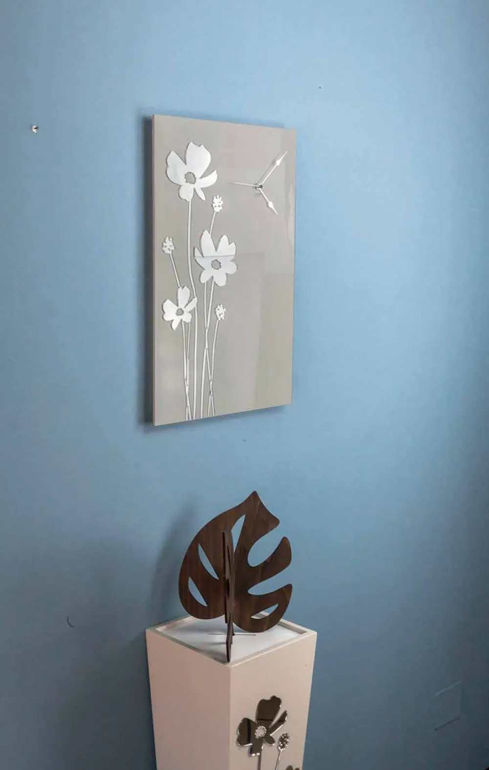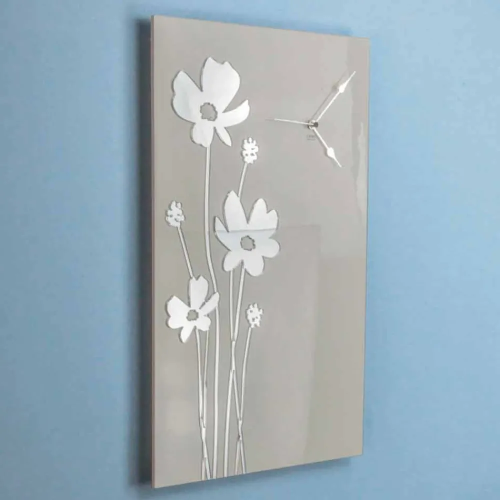 Rechteckige Wanduhr in modernem Design aus weißem Holz mit eingelegten Plexiglas-Spiegeln, hergestellt in Italien.