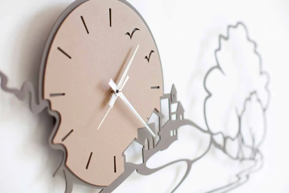 Paesello ist eine kreative Wanduhr mit dem stilisierten Design einer Landschaft, die die Vision eines entspannten und friedlichen Landes zum Leben erweckt.