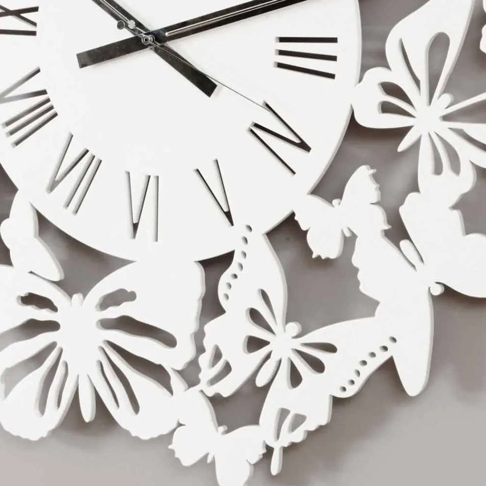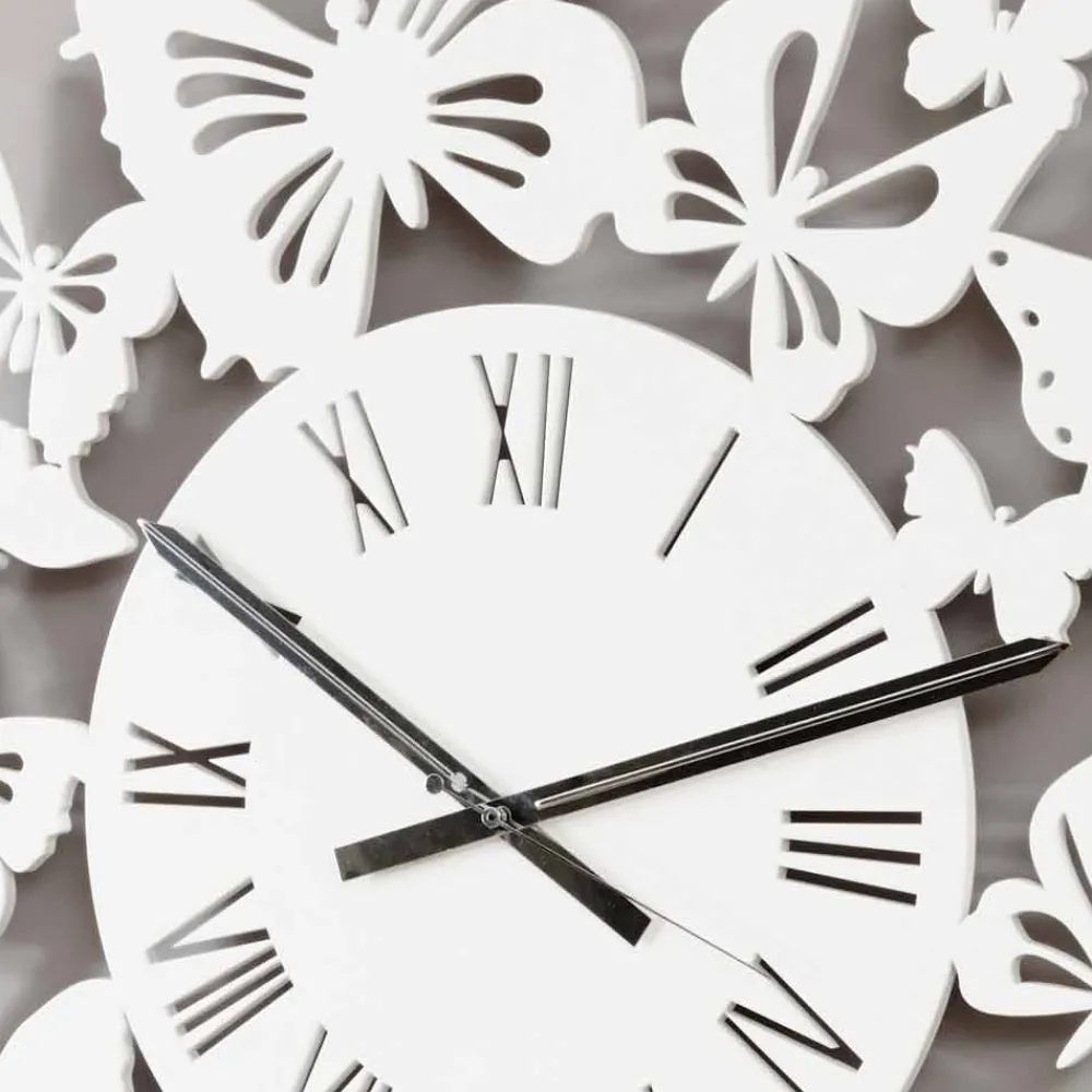 Große Wanduhr aus weißem, schwarzem, taupefarbenem, beige oder braunem Holz, rundes Design mit Schmetterlingen aus Italien.