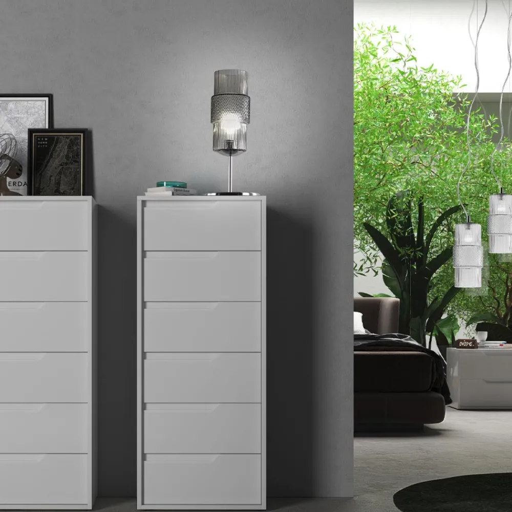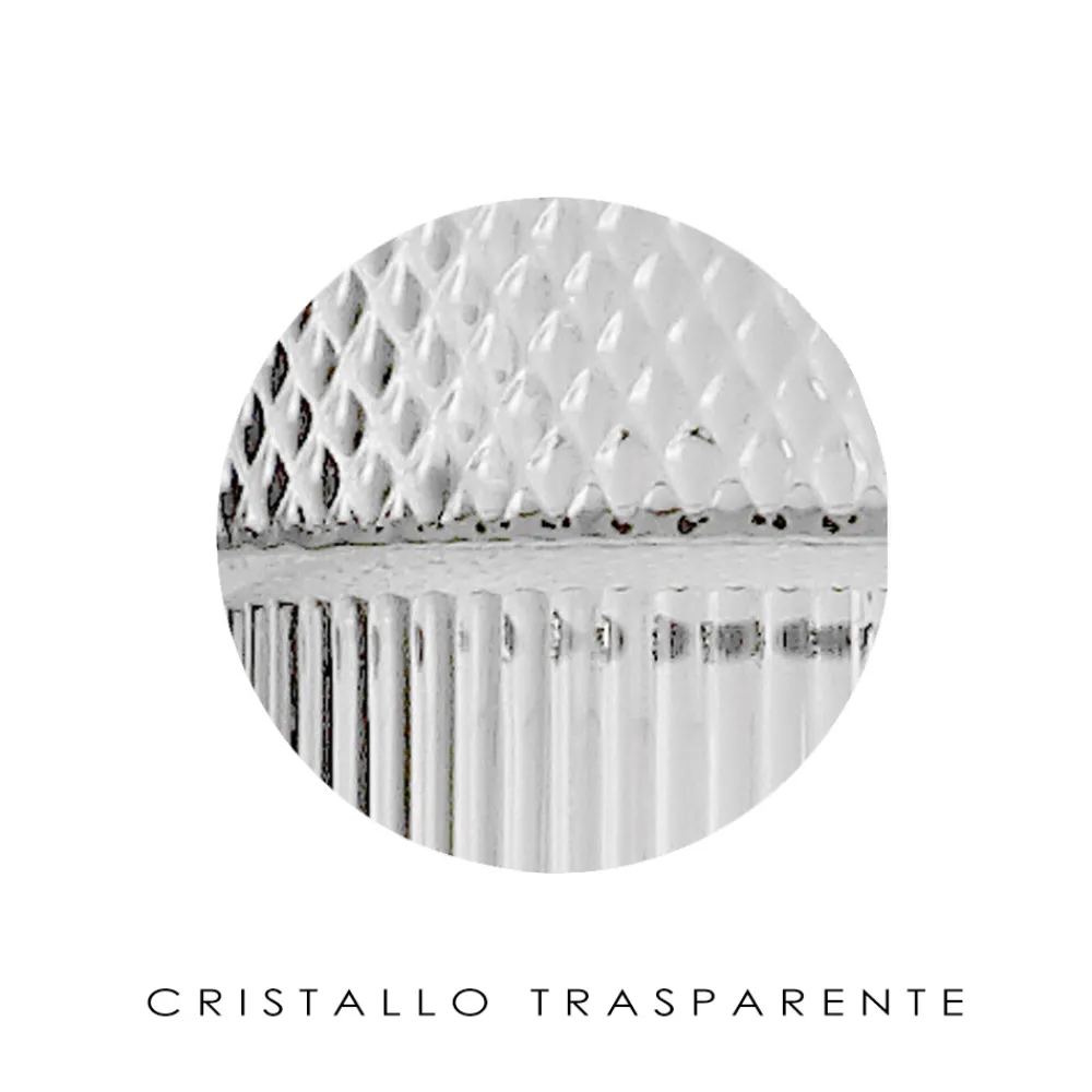 Eine raffinierte und hochwertige Ergänzung aus geschichtetem oder transparentem Glas mit Streifenverarbeitung, ideal für alle, die eine stilvolle und funktionale Beleuchtung suchen, die die Umgebung mit faszinierenden Lichtspielen bereichert.