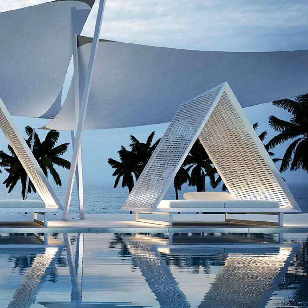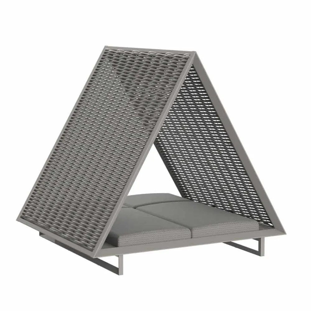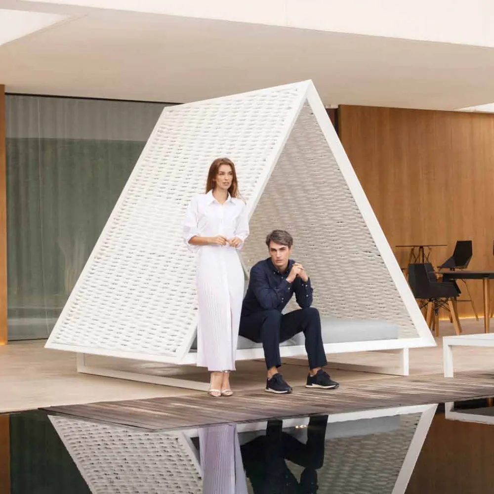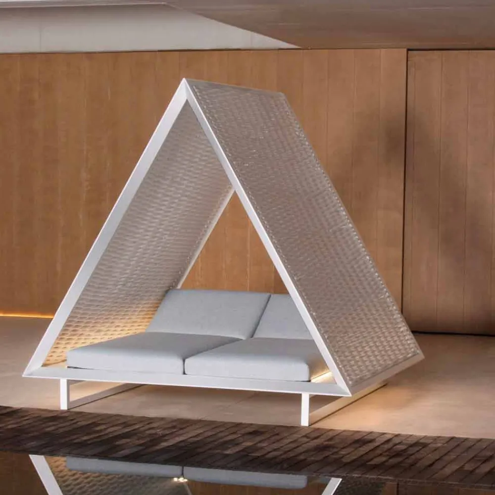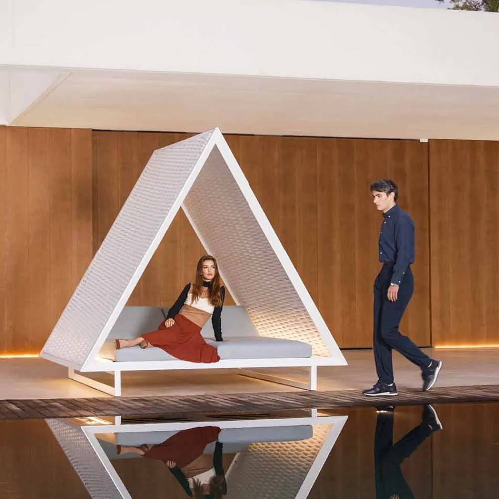 Dieses Tagesbett im Freien ist von einem eleganten Design und grenzenlosem Luxus inspiriert, mit der Idee, eine Zuflucht mit einer traditionellen pyramidenförmigen Architektur zu schaffen.